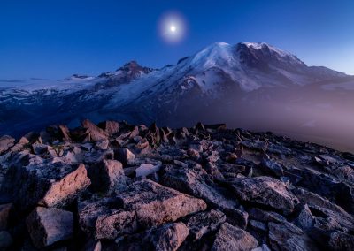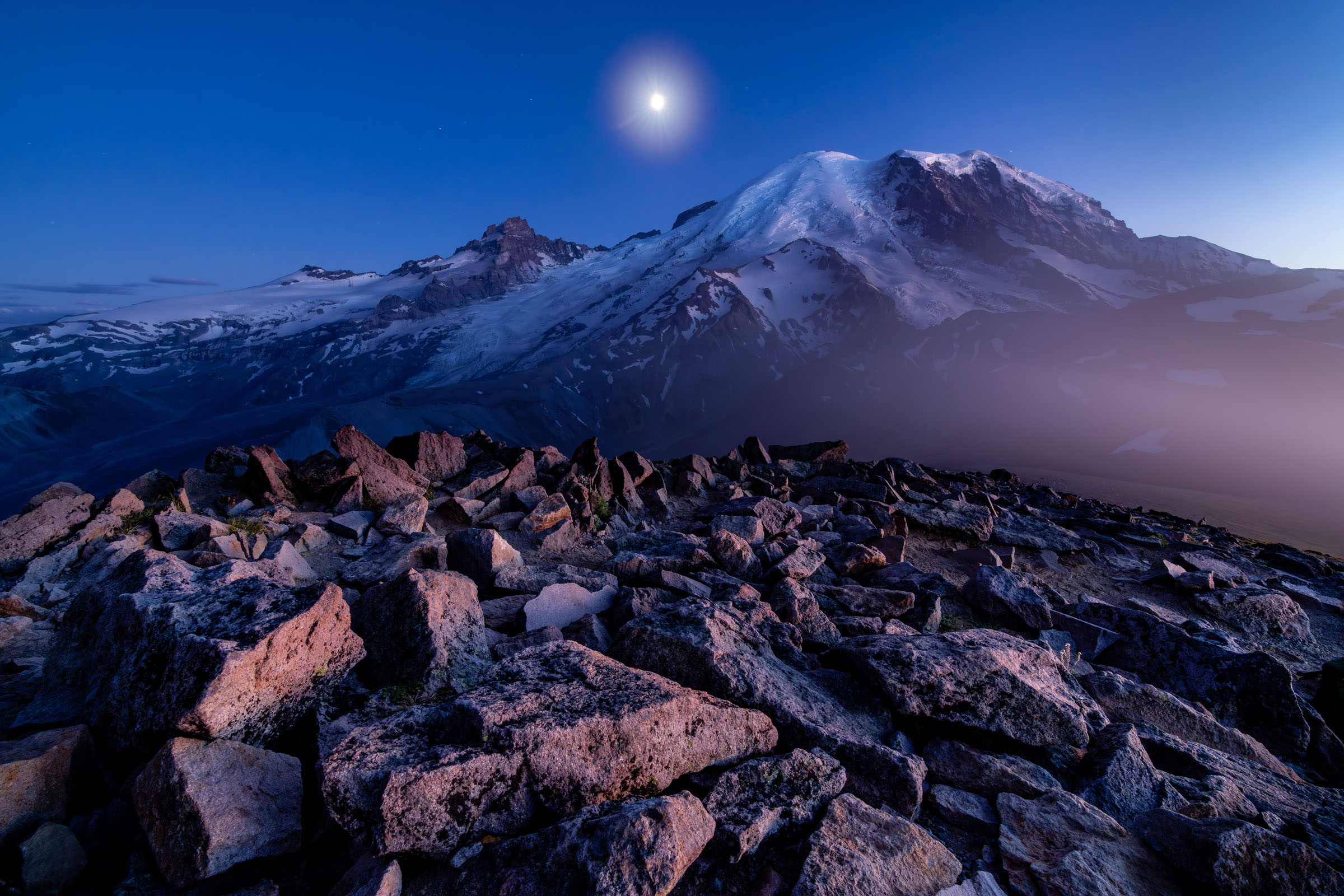 Mountain Landscape: Moonrise and clouds below Mt. Rainier at twilight in summer, Mt. Rainier National Park, Washington (dms12-032)